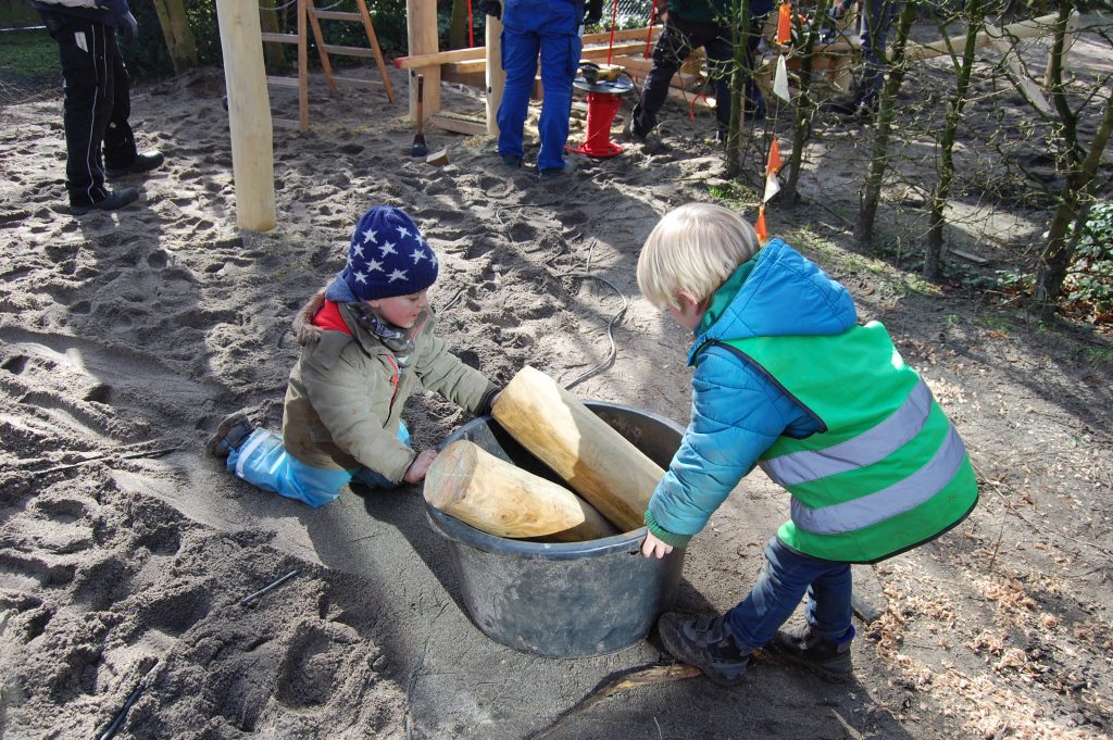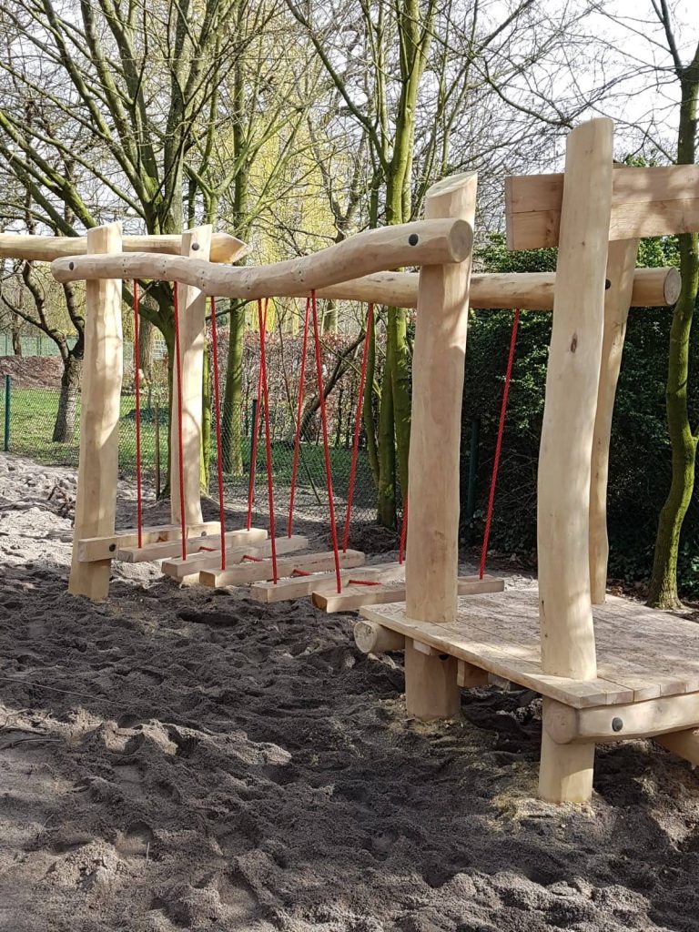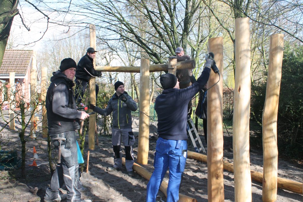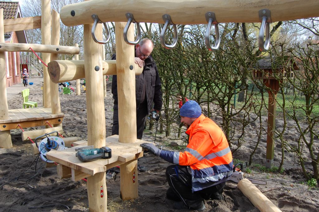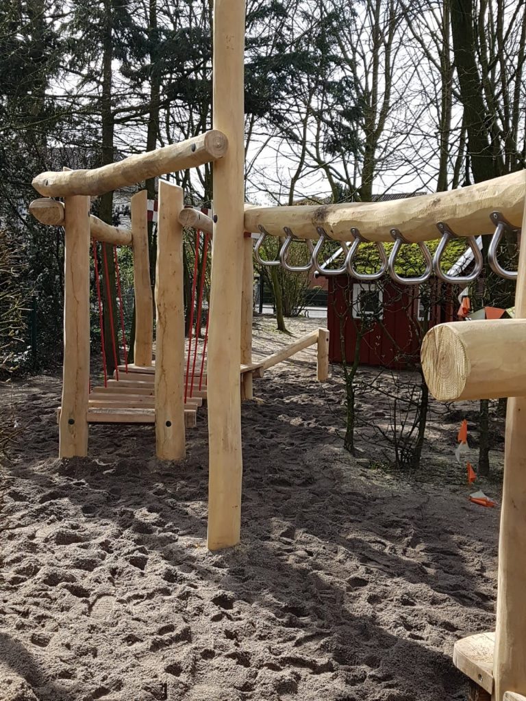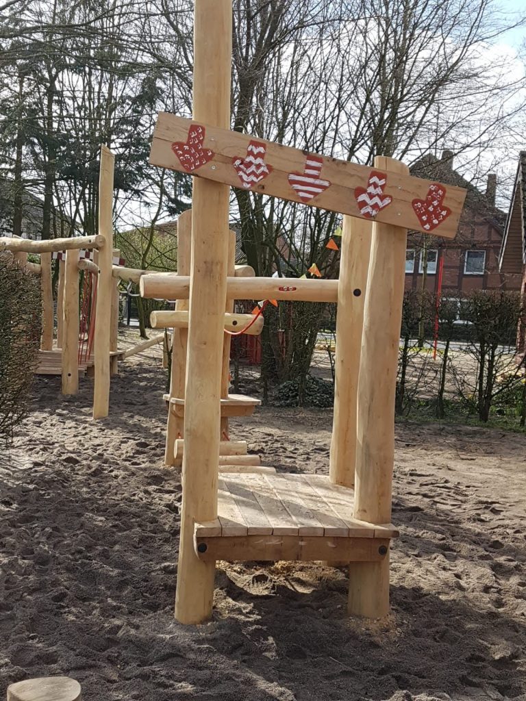 Nach der Skizze unseres Spielplatzplaners und mit Unterstützung der Firma Düvel wurde ein Kletterparcour mit Wackelbrücke, Hängesteg, Balancierbalken usw. aufgebaut. Das bereits vorhandene Spielhaus konnte durch die große Unterstützung neugestaltet werden. Außerdem