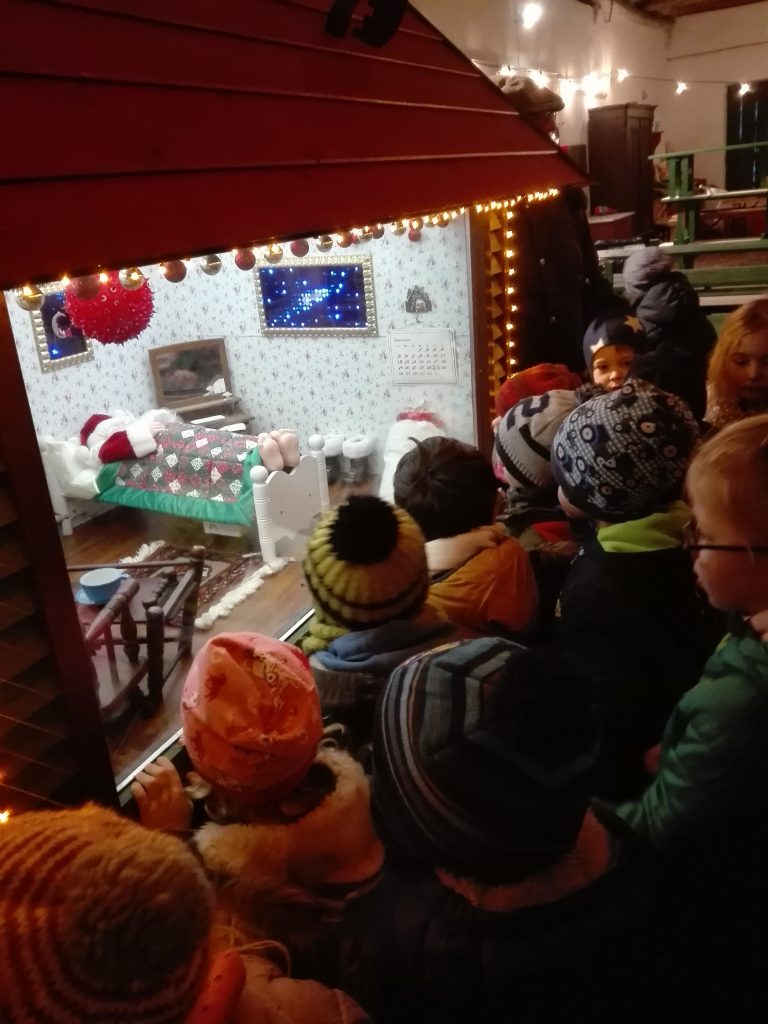 Dann ging es weiter auf die große Diele und da stand es: Das Haus vom Nikolaus. Alle Kinder drängten sich vor die Scheibe hinter der ein kleiner Nikolaus, mit nackten Füßen im Bett lag und schlief. Und als alle Kinder, wirklich alle, mucksmäuschenstill waren, da konnten wir den Nikolaus sogar schnarchen hören. Rundherum an dem Haus waren 24 Fenster mit Klappen versehen und hinter jeder dieser Adventskalendertürchen versteckte sich eine nostalgische, winterliche Szene.